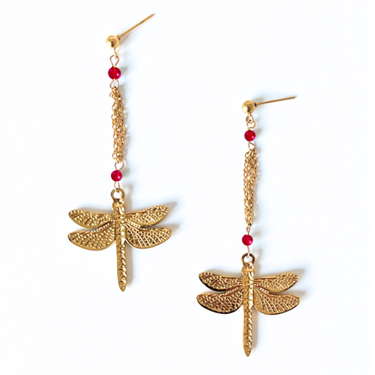 • Pendientes Camila largos dorados con libélula elegantes y artesanos Hanalima