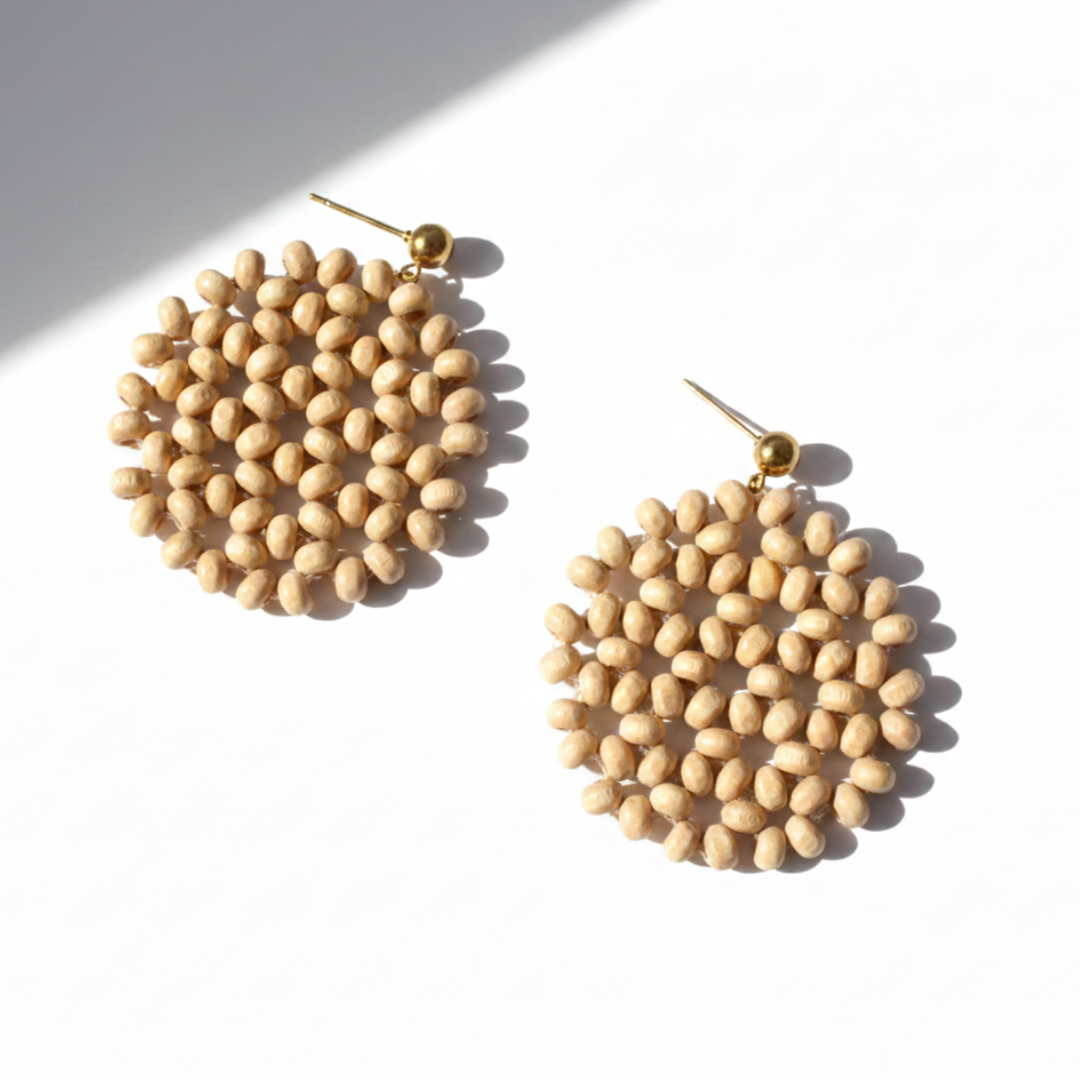 - Material: Cuentas de madera + acero inoxidable hipoalergénico