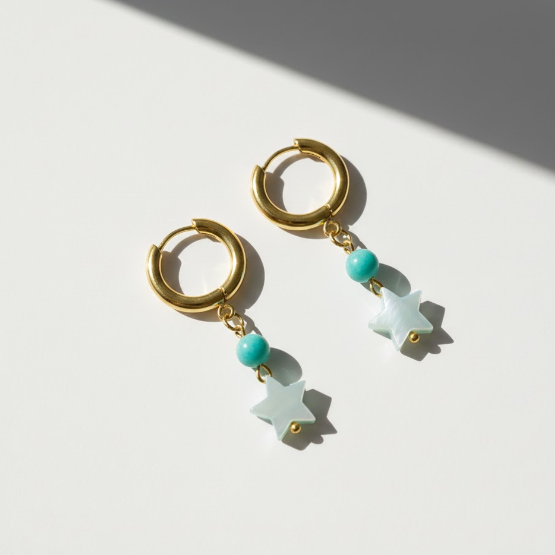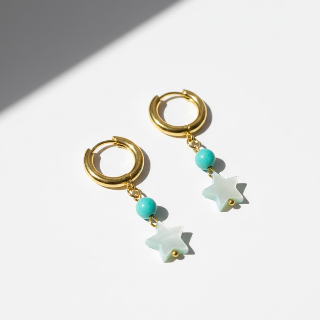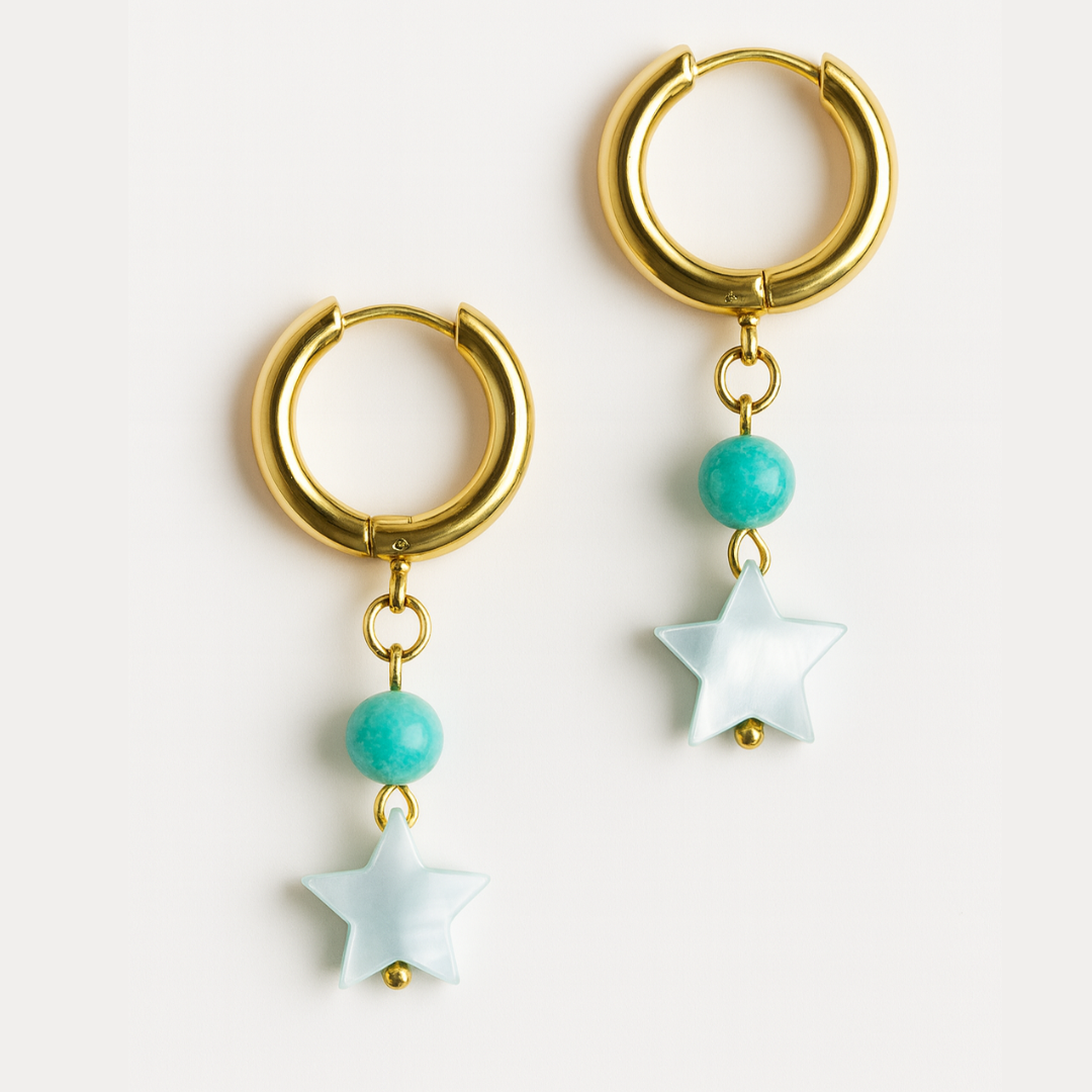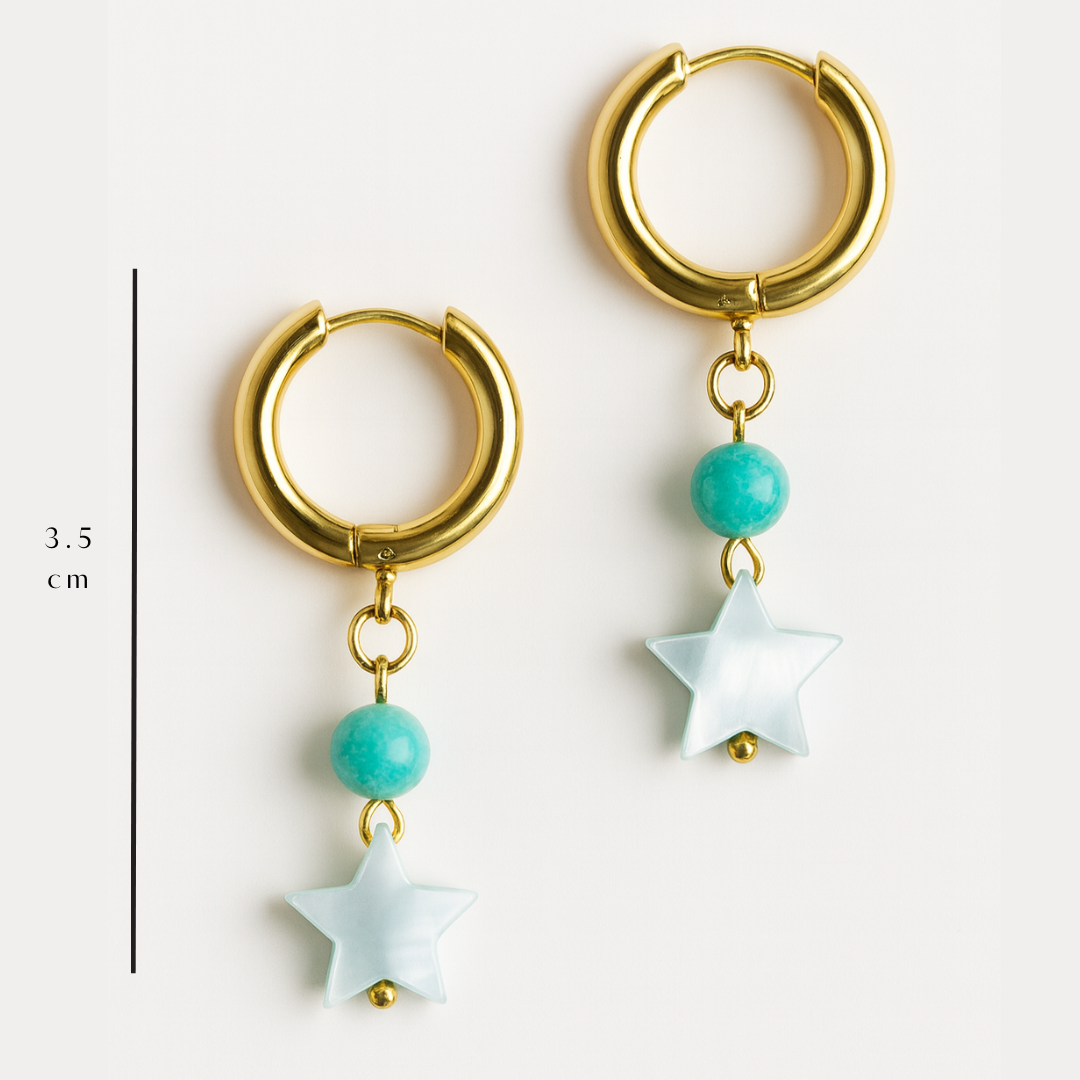 Pendientes con aro dorado y charm de estrella en acabado nácar, combinados con una cuenta azul que aporta un toque fresco y luminoso. Un diseño delicado y versátil para elevar cualquier look diario.