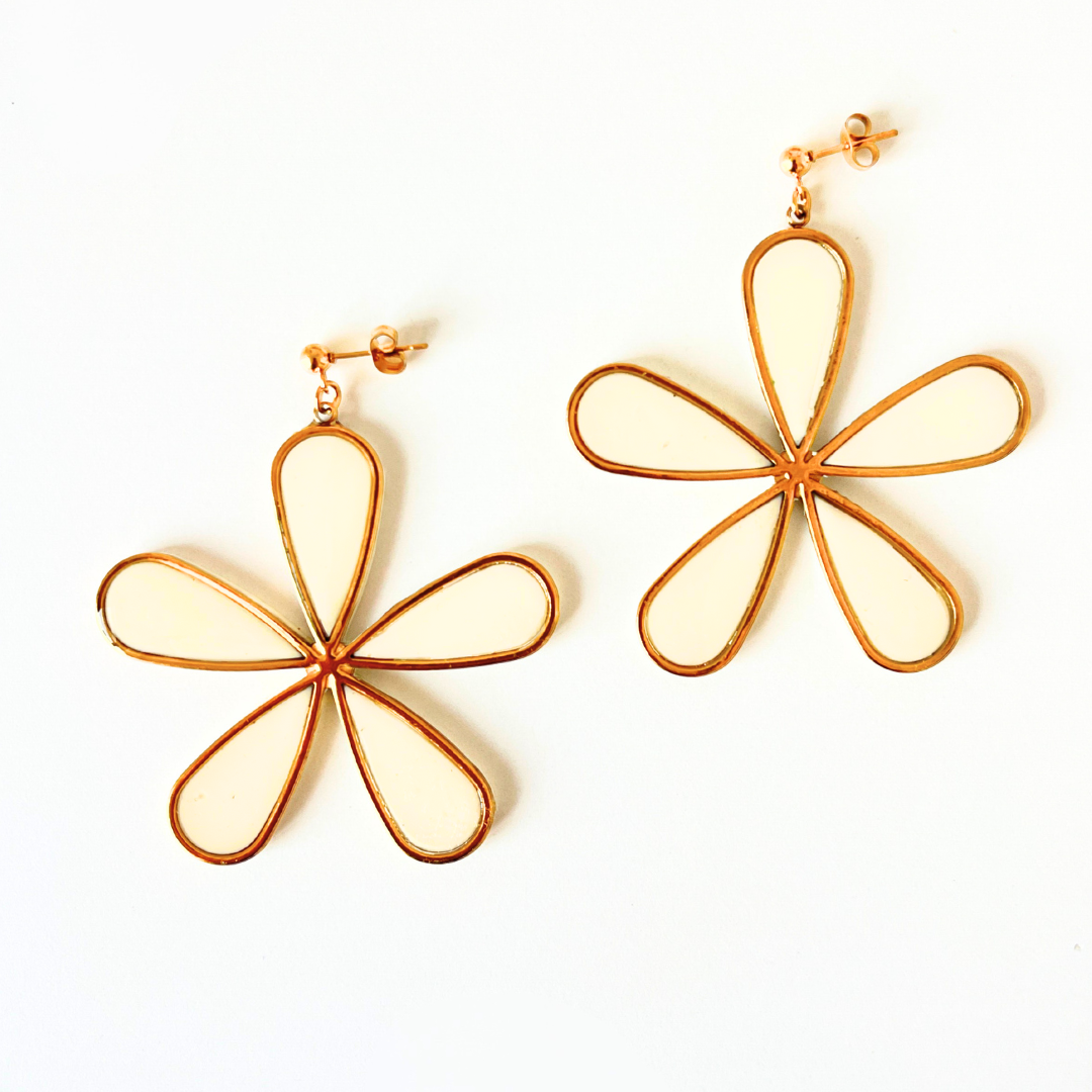Estes brincos combinam o charme artesanal da argila polimérica revestida com resina com a durabilidade do aço inoxidável . O seu design floral grande e leve ilumina o rosto e acrescenta um toque alegre, perfeito para casamentos, eventos especiais ou looks de verão.