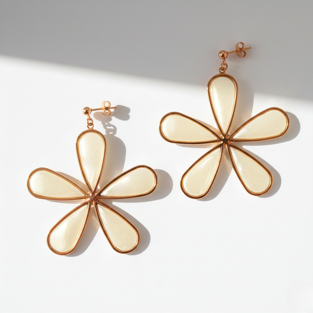 Estos pendientes combinan el encanto artesanal de la arcilla polimérica cubierta de resina con la durabilidad del acero inoxidable. Su diseño floral grande y liviano ilumina el rostro y aporta un toque alegre, ideal para bodas, eventos especiales o looks de verano.