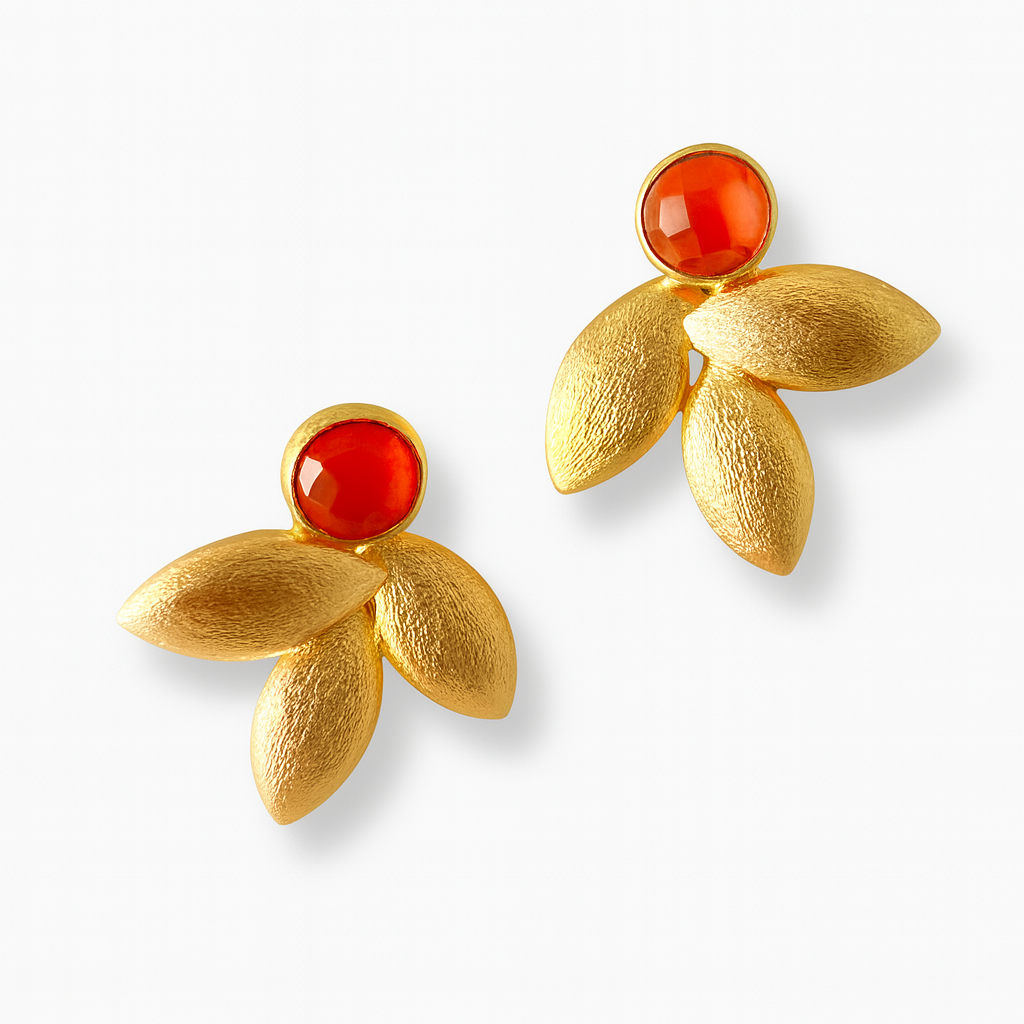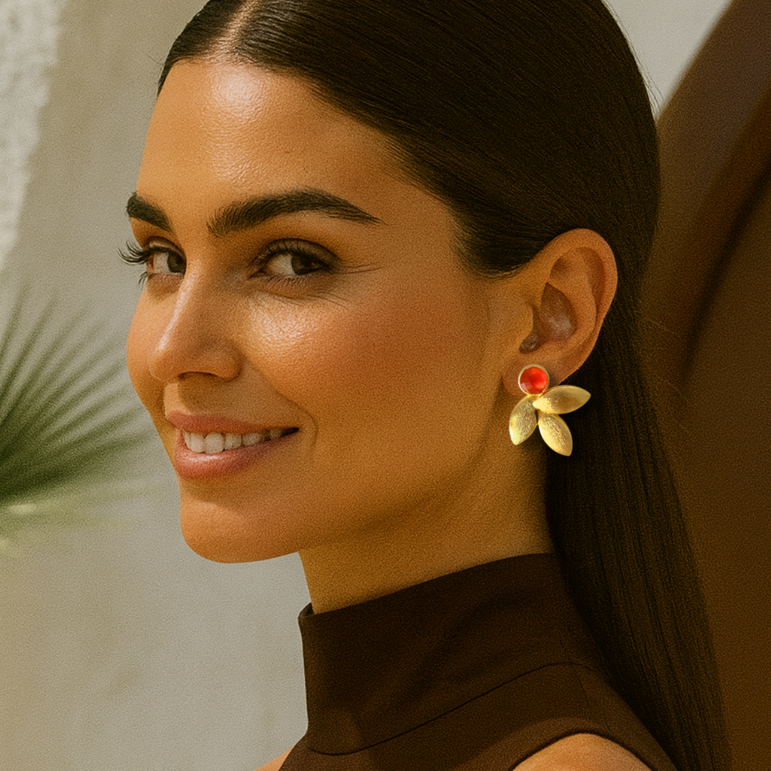Os brincos Jimena destacam-se pelo design texturizado em folha de ouro, realçado por uma pedra coral facetada que acrescenta vitalidade e elegância. Um acessório intemporal que transforma qualquer look, desde um vestido de noiva a um sofisticado traje de festa.