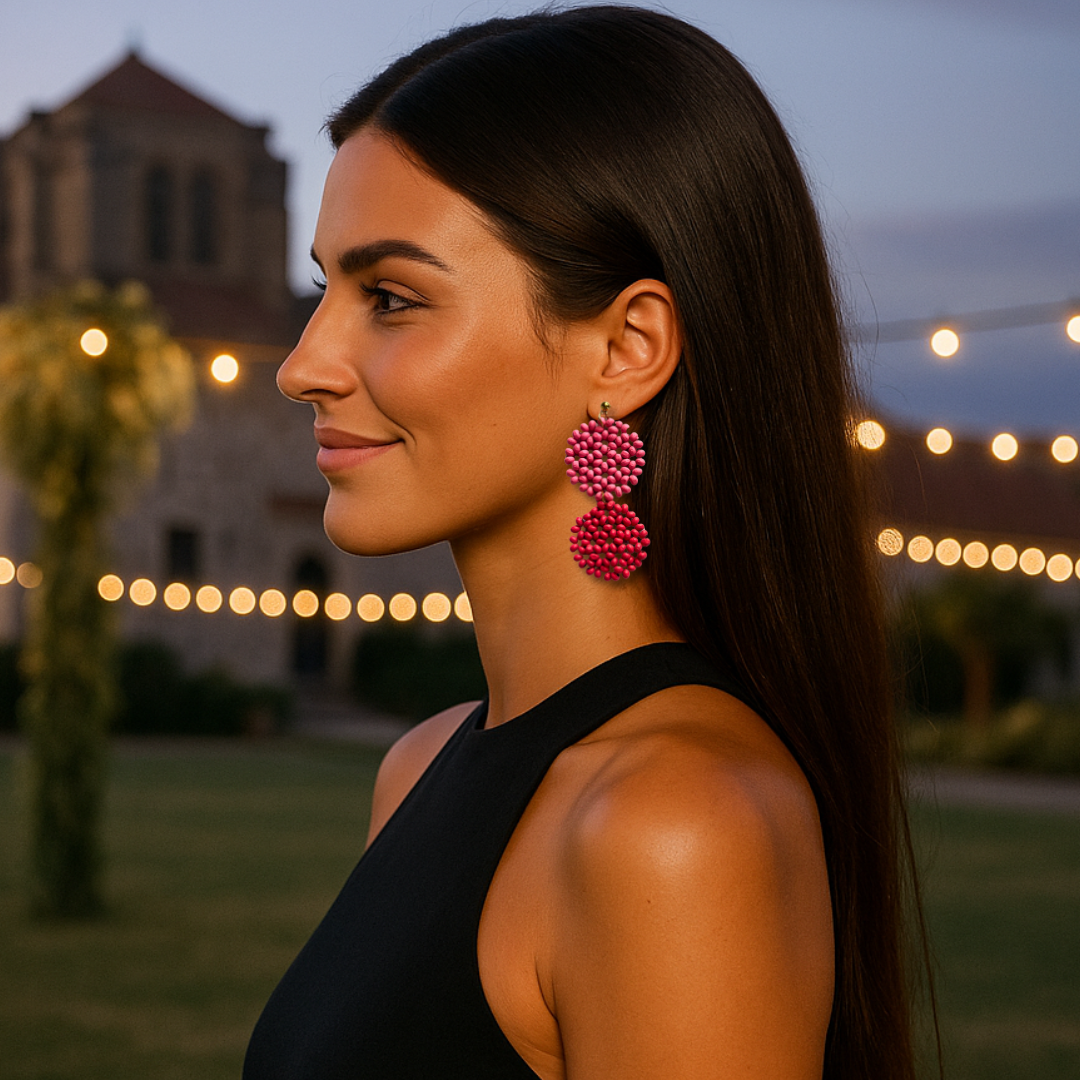 Os brincos Kalea são pura personalidade e energia. O seu design de dois círculos sobrepostos de contas de madeira vermelhas vibrantes e frescas é perfeito para quem gosta de se destacar com estilo. São ideais para aqueles dias em que precisa de um toque de cor que fale por si.