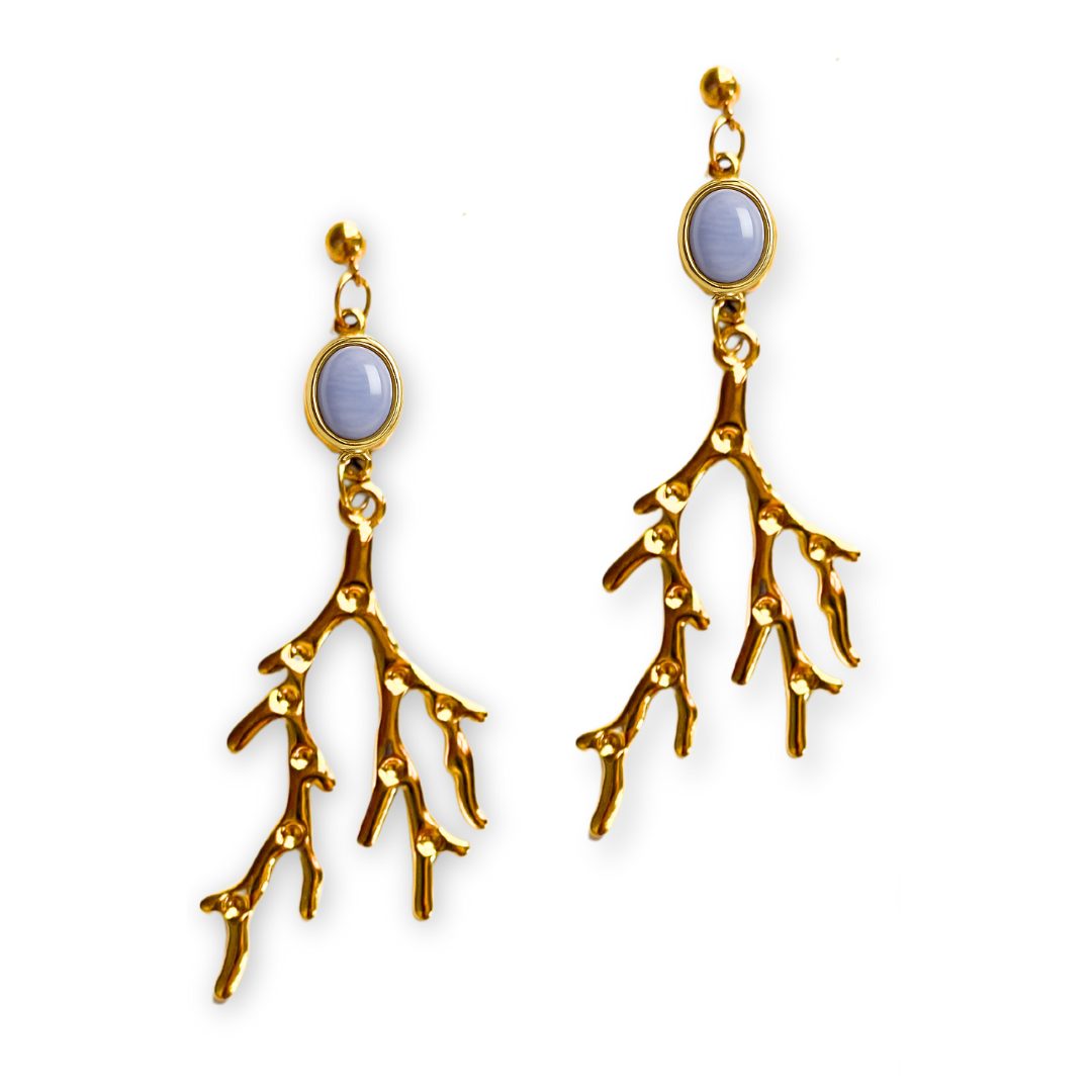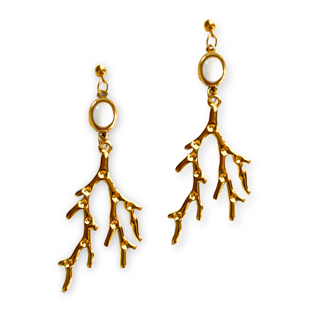 Brincos Martina: inspiração marinha e elegância vibrante.Com um design espetacular de ramos de coral dourado e uma pedra central fúcsia, os brincos Martina são uma peça marcante. O seu estilo combina a frescura do verão com a sofisticação necessária para um casamento, uma festa ou um jantar especial.