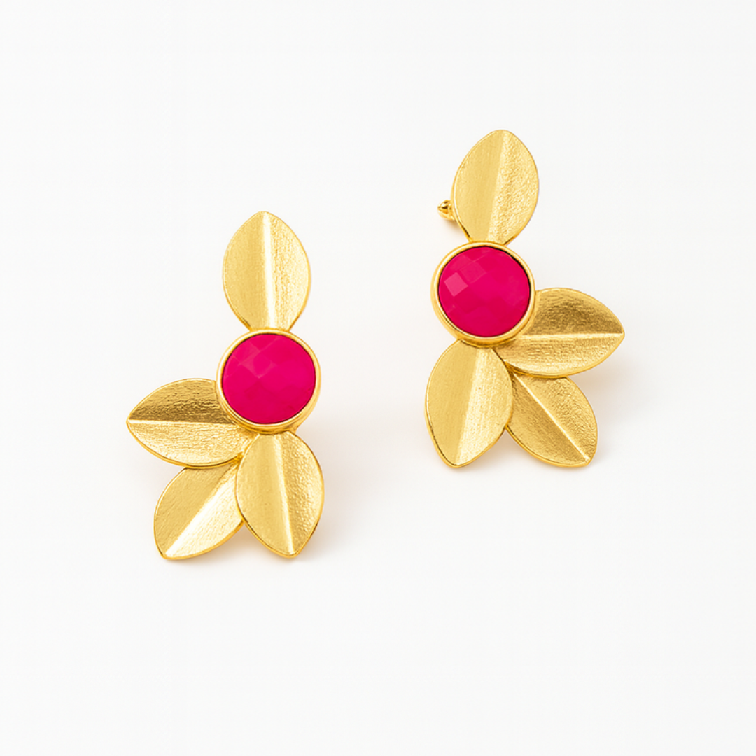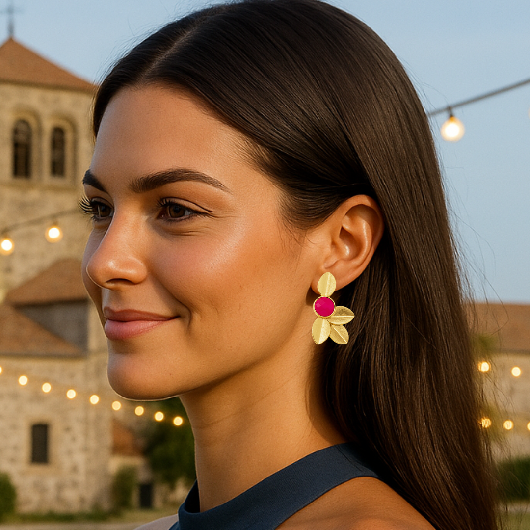 Os brincos Matilda combinam o poder do ouro com a frescura de uma pedra fúcsia que ilumina qualquer look. O seu design em folha de ouro com acabamento mate destaca-se com a pedra central facetada, criando um estilo único que eleva qualquer look, desde um look para convidadas a um look para festas.