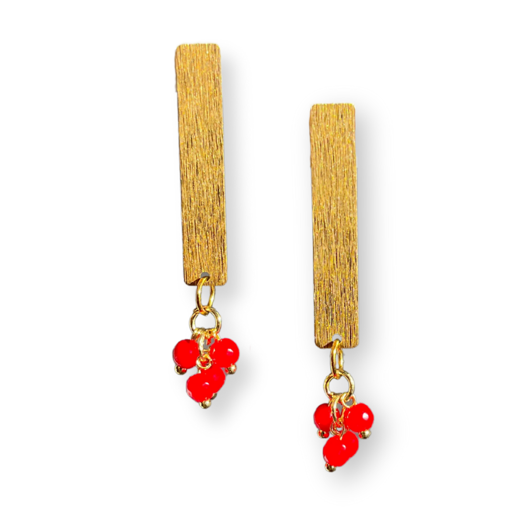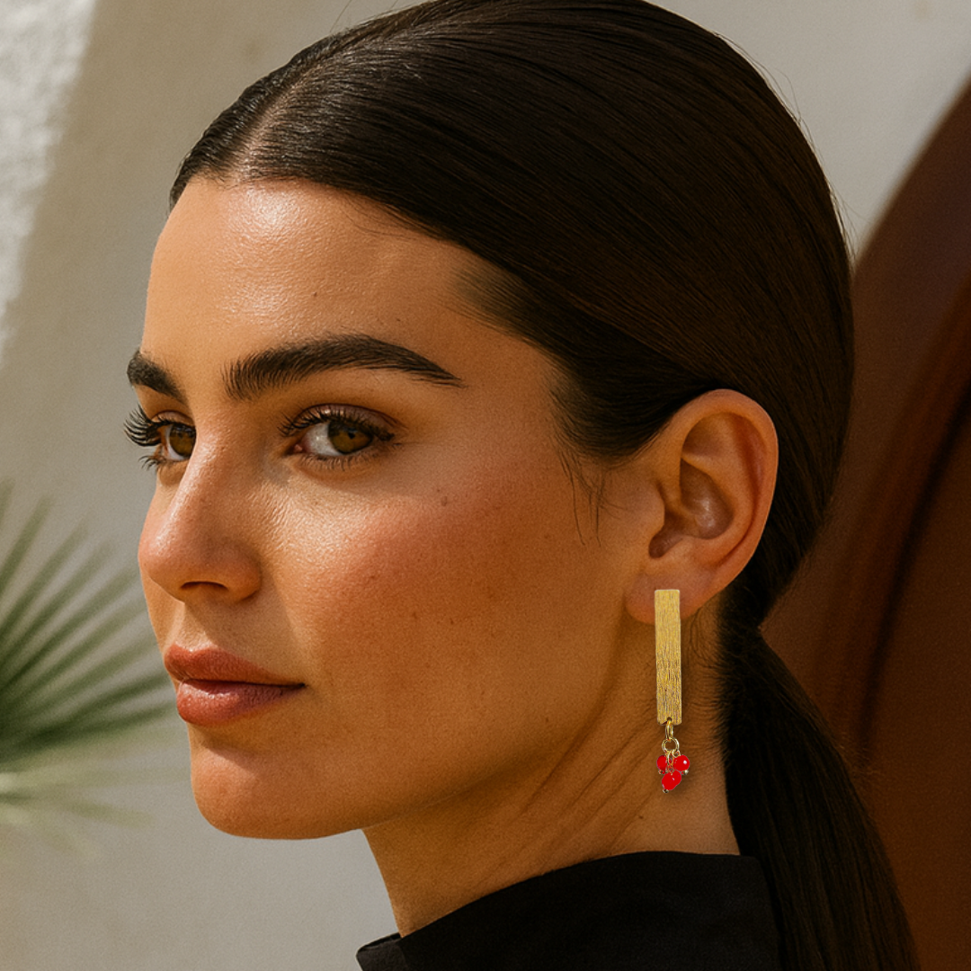 Os brincos Nara são aquele pequeno, mas poderoso, detalhe que faz toda a diferença. Um design leve e minimalista com um toque vibrante de vermelho, ideal para quem procura elegância sem esforço. Perfeitos para convidadas de casamento ou para elevar o seu dia a dia com estilo. Os brincos Nara não são um par de brincos qualquer: têm aquele "algo" que não se consegue explicar, mas que nos faz olhar duas vezes. Leves, dourados, com aquele toque de vermelho que nunca falha. Também te fazem lembrar uma feira, uma gargalhada ou um casamento de verão? Exatamente, exatamente isso.