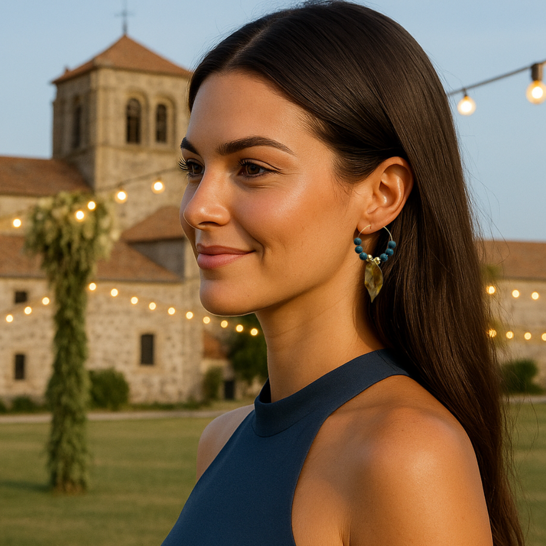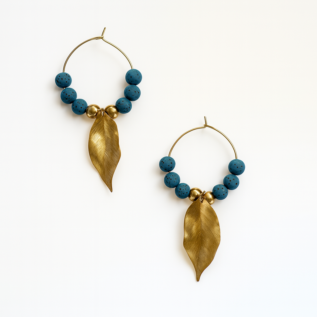 Os brincos Mia são uma mistura perfeita de força natural e elegância contemporânea. O seu design combina pedras vulcânicas azul-petróleo com uma folha de aço inoxidável dourada texturizada que pende graciosamente.