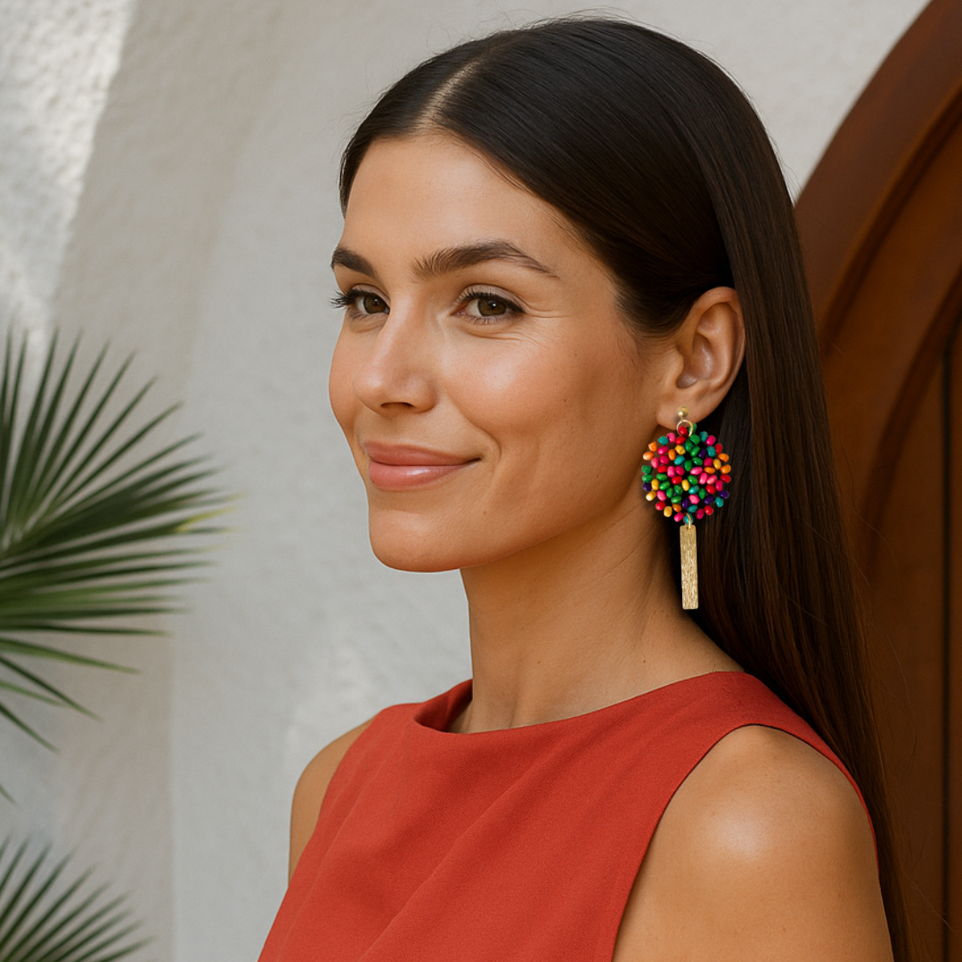 Descubra os brincos Olivia , a fusão perfeita de cor, leveza e estilo. Um design alegre com contas de madeira multicoloridas que não só iluminam o seu rosto, como também acrescentam um toque único a qualquer look. Ideais para convidados, feiras, eventos especiais ou para elevar o seu look do dia a dia com um acessório único e artesanal.