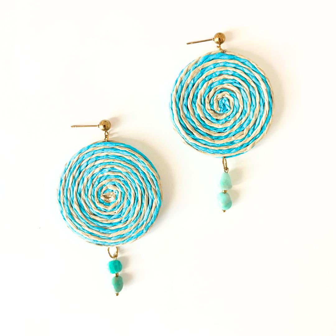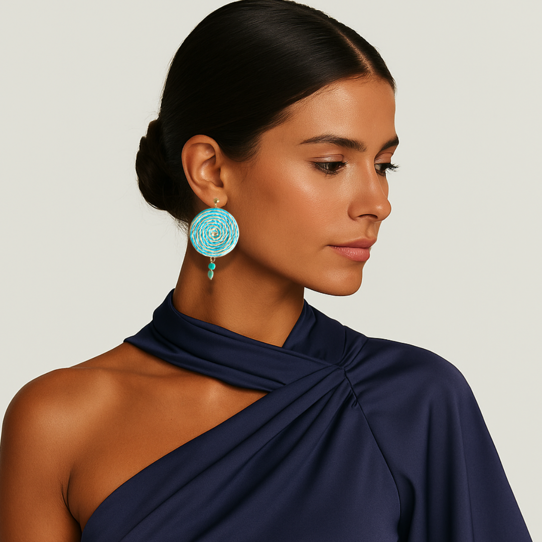 Os brincos Aoka combinam materiais naturais como a ráfia, trabalhada em espiral, com um toque de turquesa que evoca o mar, o verão e a vontade de celebrar.