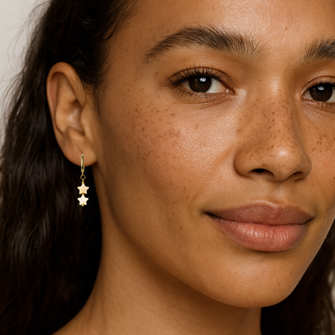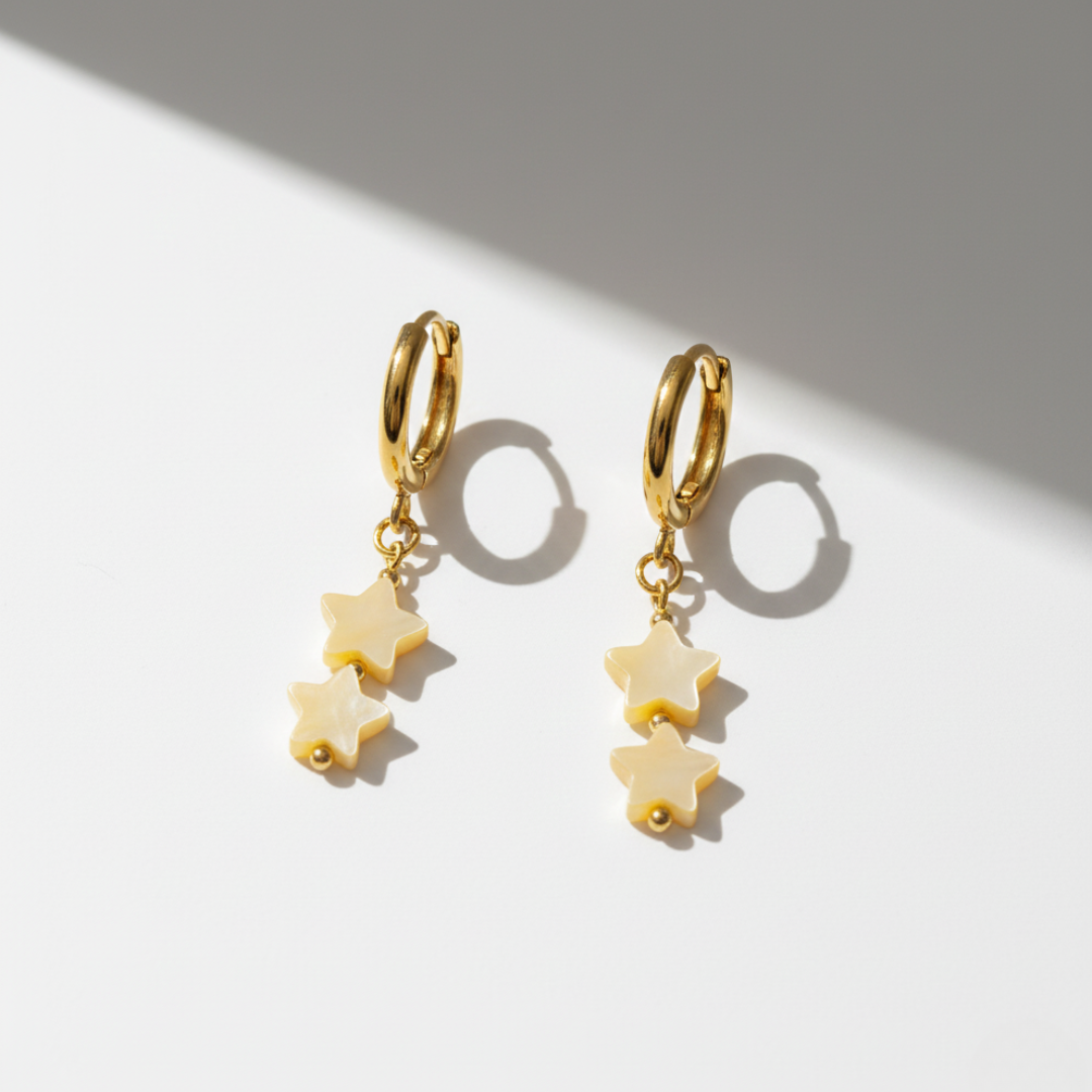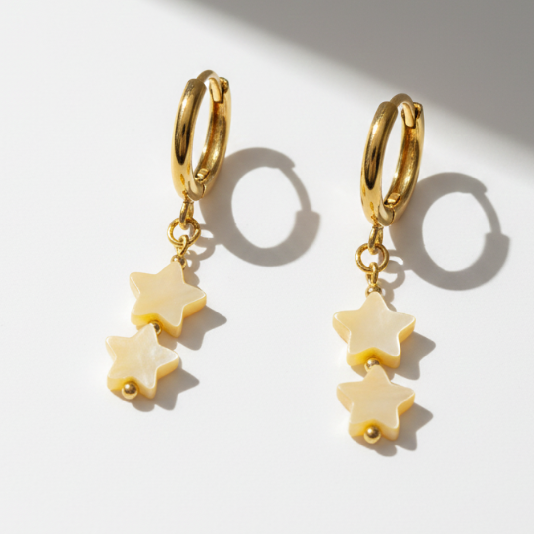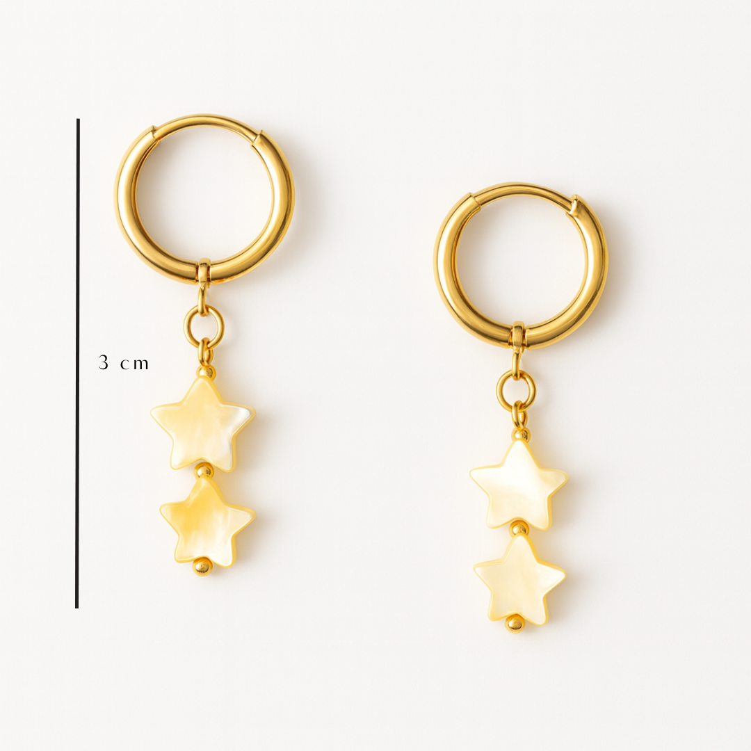 Pendientes dorados con dos estrellas en acabado nácar que aportan un brillo suave y elegante. Ligeros, cómodos y perfectos para llevar a diario o dar un toque especial a cualquier look.